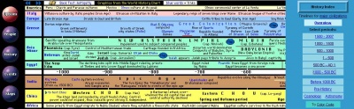 [http://www.hyperhistory.com/online_n2/History_n2/a.html hyperhistory] ist eine Website, auf der die Menschheitsgeschichte übersichtlich, in [http://de.wikipedia.org/wiki/Peters_Synchronoptische_Weltgeschichte synchronoptischer] Form dargestellt sind. Geordnet nach geographischer Region und Zeit sind die wichtigsten Ereignisse in einer Zeitachse aufgeführt. Über Links können Details, Persönlichkeiten und Hintergründe aus Kultur, Politik, Wissenschaft usw. aufgerufen werden.